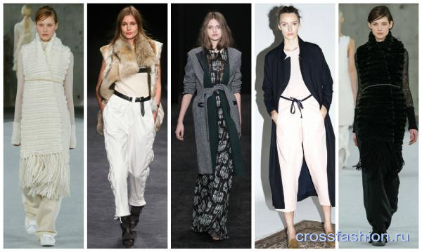 В моде сочетание разных фактур, многослойность и объемность. Пояс желательно повязывать на широкие свитеры и кардиганы, акцентируя таким способом внимание на талии. Из-под одежды-оверсайзд может небрежно показываться рубашка чуть подлиннее, ворот блузки или комплект с теплой безрукавкой. С платьями все классически – поясок на талии подчеркивает женственные формы и немного разбавляет скучный образ. В тренде дуэты легких юбок и объемных свитеров, поверх которых повязывается ремень.