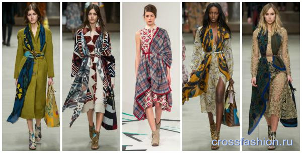 Самый удачный вариант этого тренда показан в коллекции Burberry Prorsum. Чтобы попробовать эту тенденцию просто накиньте на шею длинный платок с красивым принтом, а поверх него на талии застегните ремень. Таким способом повязываются как узкие шелковые и шифоновые платки, так и более плотные палантины и даже шарфы грубой вязки.