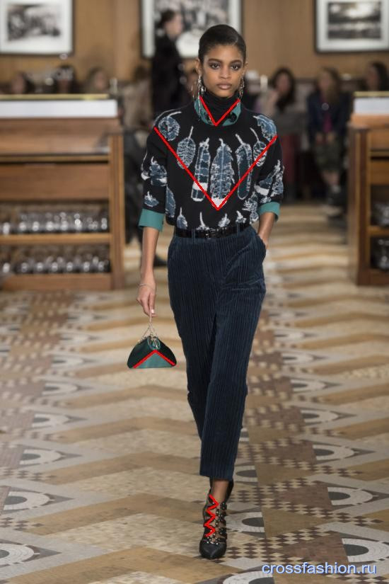 Например, знакомый образ из коллекции Altuzarra fall 2018: деталь рисунка джемпера — перо повторяется в серьгах. (серьги крупно на фото ниже). Видно, что это не перо в его первоначальном виде, а, скорее, веточки или развивающиеся на ветру клочки шерсти — фантазия может подсказать разные ассоциации, однако по форме и эмоциональному отклику рисунок пера и рисунок сережек имеют что-то общее.