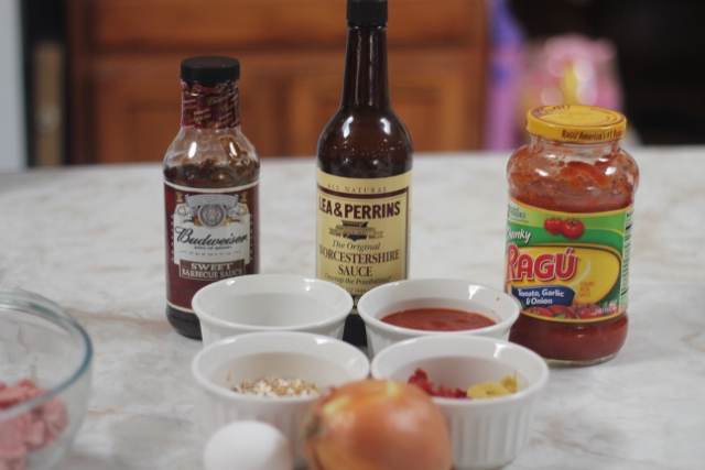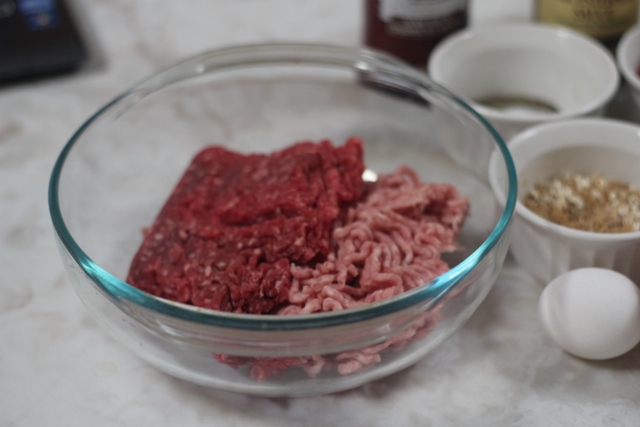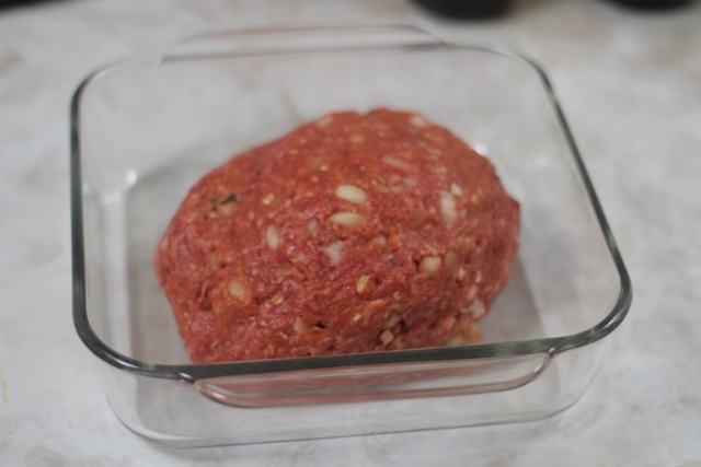 1.Фарш - я не готовлю большую порцию,беру примерно 750гр. В Америке принято делать meatloaf из говядины,но я смешиваю со свиным фаршем в пропорции 3:1.