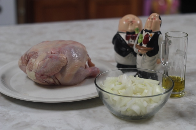 Далее, делаем маринад, он очень прост - лук + соль и перец + подсолнечное масло. Я обычно делаю маринад в пищевом пакете,туда кладу цыпленка,пакет закрываю и обваливаю нашу птичку в этом маринаде.