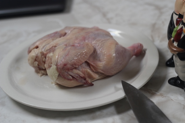 Цыпленка разрезать по брюшку, чтобы придать ему более плоскую форму.