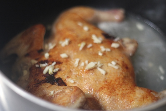 В кастрюлю (объем,в зависимости от размера цыпленка) наливаем на дно немного воды. Ставим на огонь. Когда цыпленок поджарился,выкладываем его в кастрюлю,посыпаем рубленым чесноком и накрываем кастрюлю крышкой,даем потушиться минут 10-15.