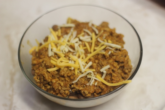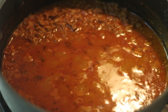 Фарш обжариваем на сковородке, добавляем специи по вкусу, порошок красного перца. Перец я беру не слишком острый, всего 1 ч.л. Перемешиваем, добавляем воду, чтобы прикрывала фарш, тушим минут 15.