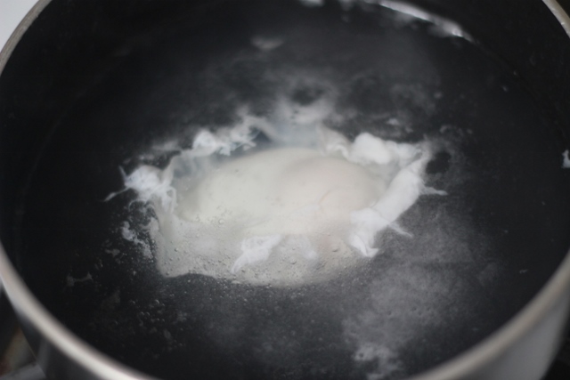 Яйцо разбиваем в миску, в кастрюлю с кипящей водой ( но на среднем огне), осторожно выливаем яйцо, варим в течении 2-3 минут, в зависимости от того, насколько жидким вам нравится желток.