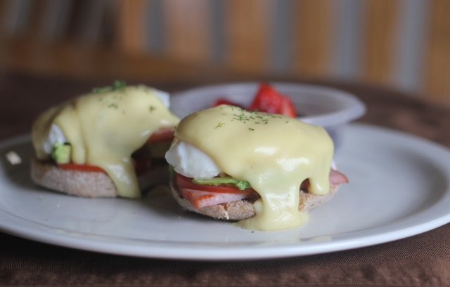 На каждую половинку булочки кладем ветчину, затем ломтики помидора и авокадо, далее кладем яйцо пашот. Поливаем сверху приготовленным голландским соусом.