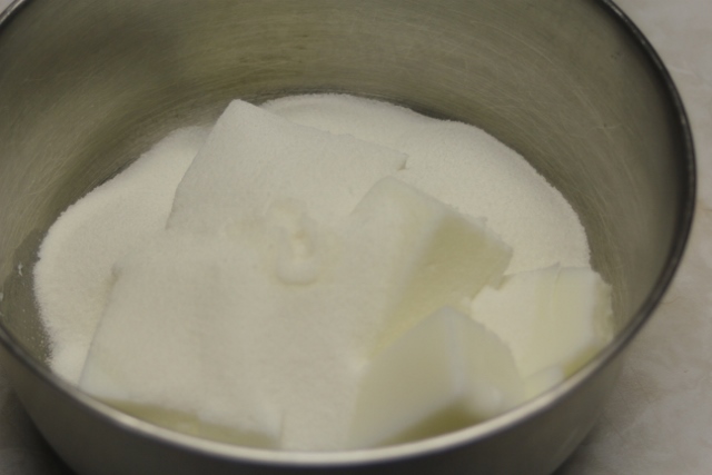 В глубокую посуду выложим жир комнатной температуры, мягкий, порежем на небольшие куски. Смешаем с сахаром и взбиваем миксером до кремообразной консистенции.