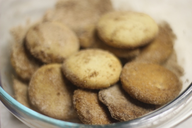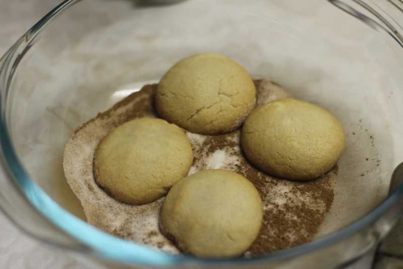 Готовое печенье вынимаем из духовки и сразу выкладываем в миску с сахаром и корицей, перемешиваем аккуратно и оставляем до остывания.