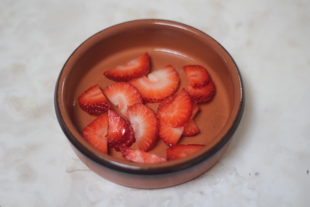 Нарезать тонкими полосками клубнику ( 1-2 штуки)