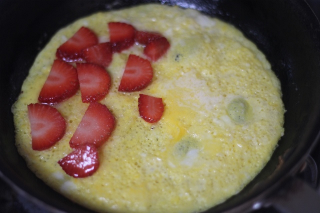 Как только омлет приготовился (поверхность омлета равномерно прожарилась), на одну половинку выкладываем клубнику.