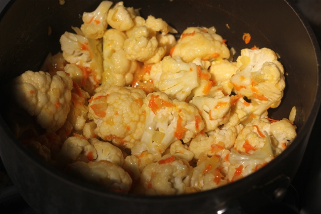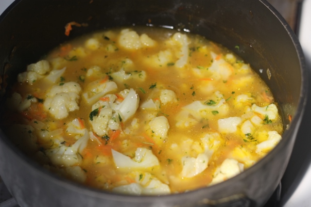 Растопить 3 ст.л. масла в кастрюле и обжарить морковь, лук, добавить цветную капусту (при необходимости добавьте масло, чтобы капуста не подгорела), убавить огонь и тушить овощи минут 20.