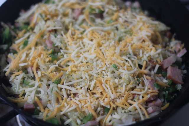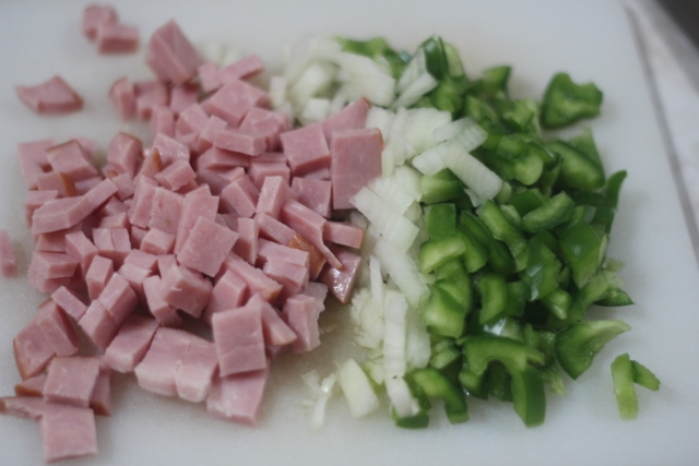 В отдельной сковородке пассируем овощи в течении 5-10 минут, затем добавляем ветчину, жарим еще 5 минут.