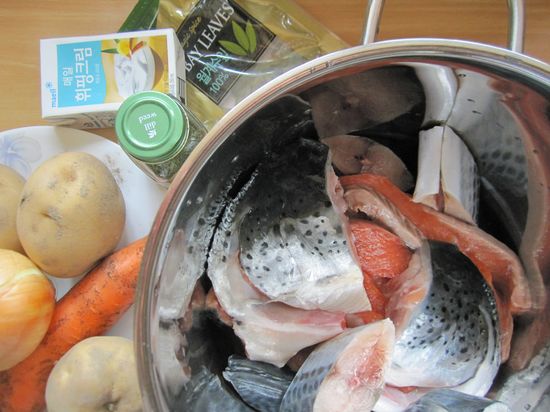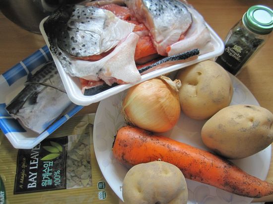 1,5 кг голов и костей семги (мы покупаем суповой набор из голов и костей);
