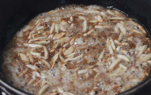 На сковороде обжариваем до золотистого цвета орешки, после, добавляем масло и сахар. Жарим еще примерно 3 минуты до растворения сахара.