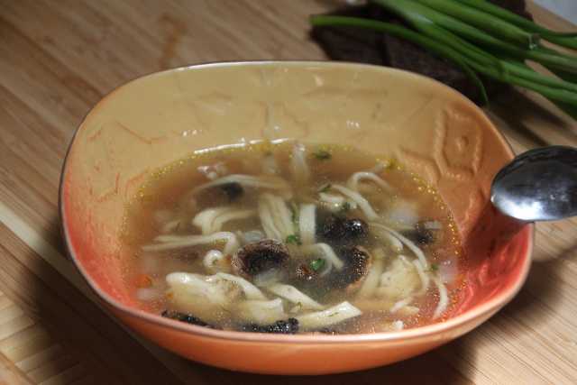 А на обед был вкусный суп с сушеными грибами и домашней лапшой. В магазине была на грибы большая скидка,я по-моему,забрала все,что там было,принесла домой и поняла,что если не засушу - испортятся.В общем,теперь у меня целый мешок сушеных грибов.