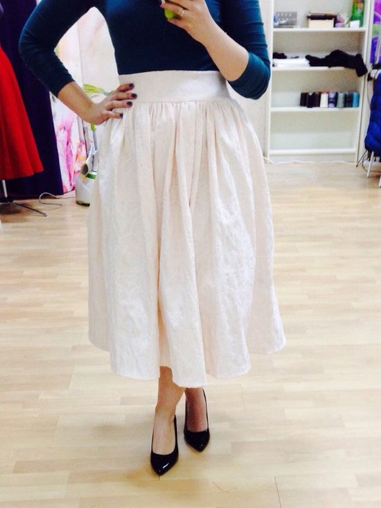 Ткань хлопковый жаккард и нежнейший подклад из батиста (хлопок и шелк 100%), носить очень удобно и приятно. Длину корректирую в мастерской после примерки.