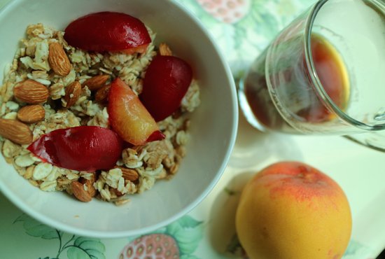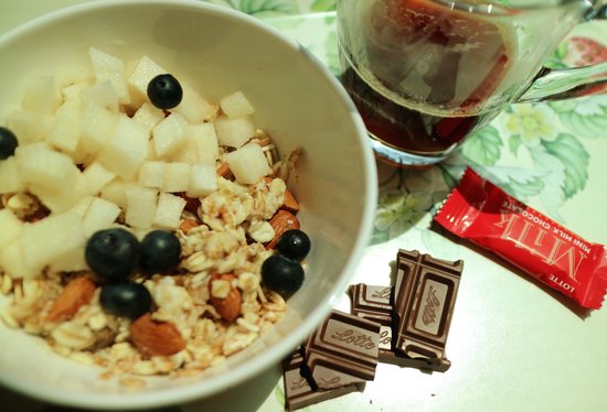 2. Через 2 часа - овсянка, заваренная кипятком с орехами и немного шоколада.