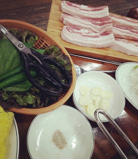 Мясо готовится на углях прямо за столом самими же посетителями. Кажется, что очень жирное, но жир вытапливается и стекает, остается мясо, которое едят исключительно с листьями салата, китайской капусты и другими растительными закусками, никаких простых углеводов типа риса, хлеба или картошки. Главное не наесться привезенного из России зефира!