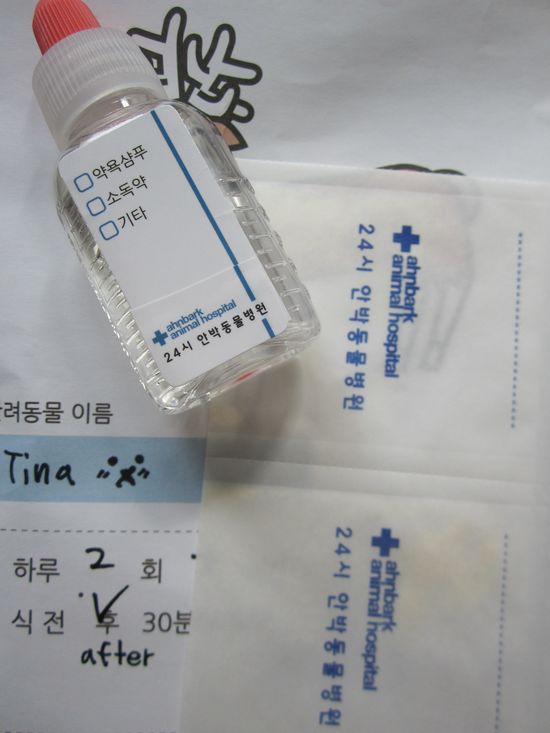 Доктор, он же хозяин клиники (Dr. Ahn), определенно кошатник! Кошки там повсюду: на ресепшне сидел большой кот очень похожий на перса, который, пока мы ждали приема, спрыгнул со своего наблюдательного пункта и подошел к Тининой переноске, из другого кабинета вырулила молодая серая кошечка и села напротив нас, в кабинете врача висел большой портрет кошки, да и миска с кошачьим кормом на ресепшне как бы намекала...