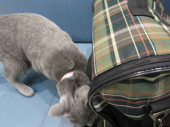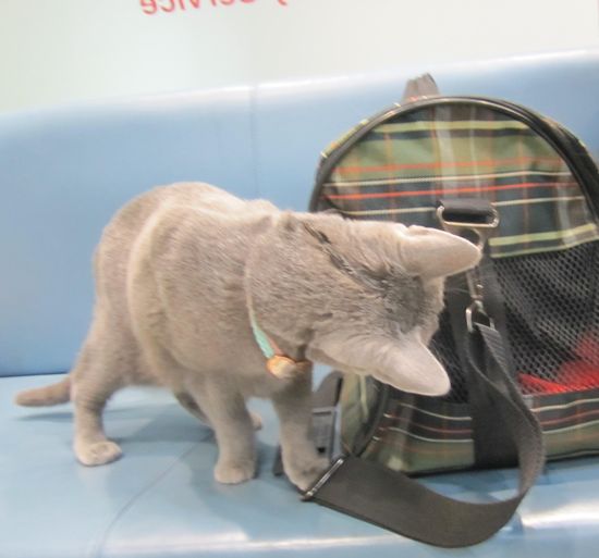 Далее случилось следующее: серая кошечка решила выяснить, кто сидит в нашей переноске. Тина была явно не рада столь бесцеремонному вторжению и начала шипеть, но серая кошка не отреагировала. Тогда Тина ударила по переноске лапой и, видимо, сделала это столь резко и ощутимо, что наглая серая кошка забыла про свое любопытство и убежала на ресепшн.
