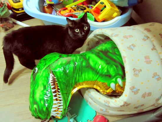 Сегодня сфотографировала очередную комичную ситуацию: пришла кошка Тина к своему домику, поваляться после завтрака, а там... занято! (Младший сынишка решил, что надувному динозавру тоже нужен дом