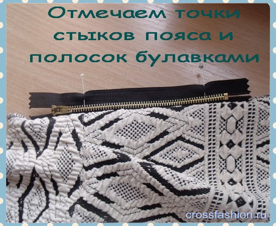 Небольшой совет: если у Вас ткань как у меня, с рисунком, требующим подгонки, то на помощь нам придут булавки. Когда мы пришили одну половинку замка, то нам надо застегнуть его и на непришитой стороне отметить точки совмещения, а также точку соединения юбки с поясом.