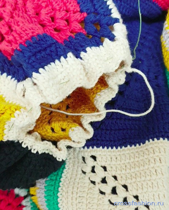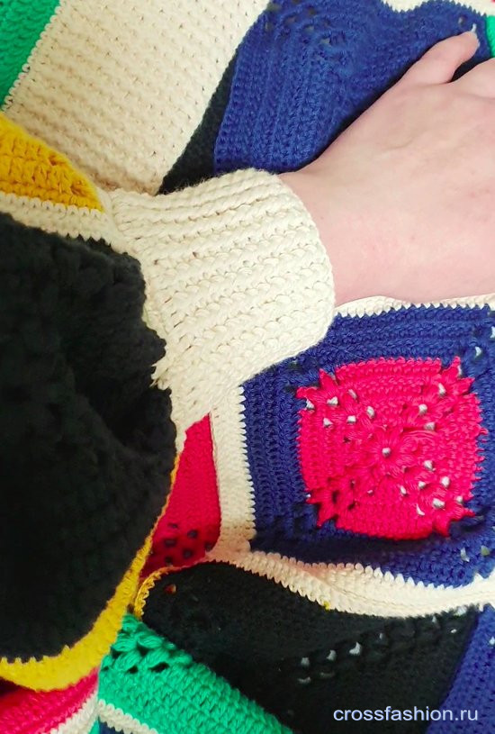 Большинство элементов одноцветные, но из остатков ниток я делала разноцветные квадраты, которые довольно органично вписались в общее полотно изделия.