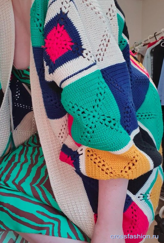 Вообще, кардиганы, связанные из элементов — не новинка. Одежда, собранная из так называемых бабушкиных квадратов давно в ходу среди рукодельниц, но она мало востребована из-за выраженной этнической составляющей. Кардиганы из традиционных бабушкиных квадратов (связанных из остатков ниток) довольно сложно вписать в современный городской стиль.