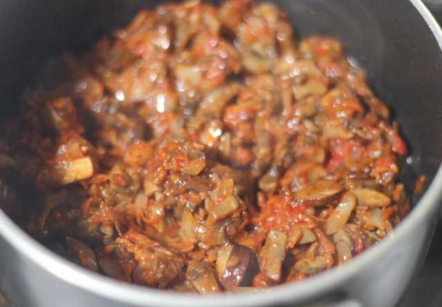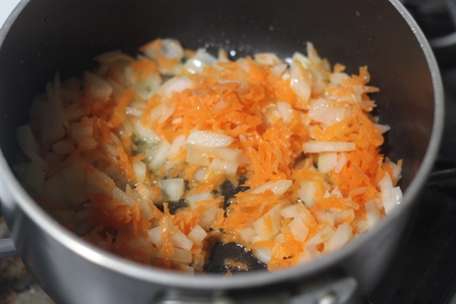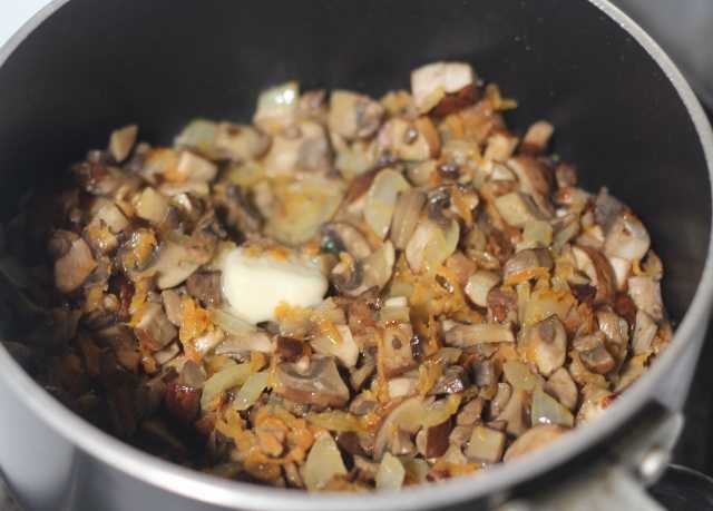 Лук шинкуем, морковь трем на мелкой терке, грибы режем на мелкие кусочки. В кастрюле растапливаем 50 гр. масла, пассируем лук и морковь, как только лук примет золотистый цвет, убавить огонь и пассировать до очень мягкой консистенции.