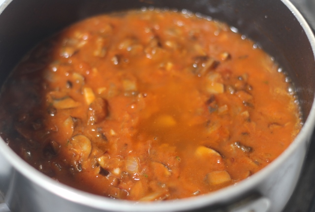 Далее, добавляем овощной бульон. Солим, перчим. Доводим до кипения.