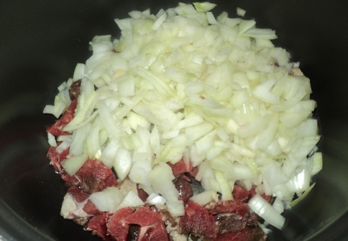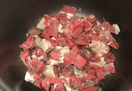 1)Режем мясо кубиками, на дно мультиварки наливаем немного подсолнечного масла и выкладываем мясо.