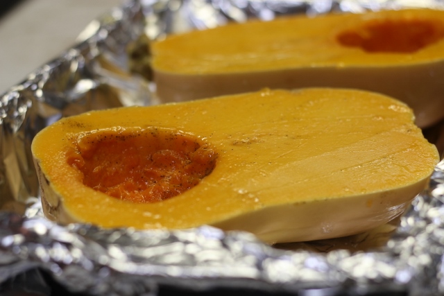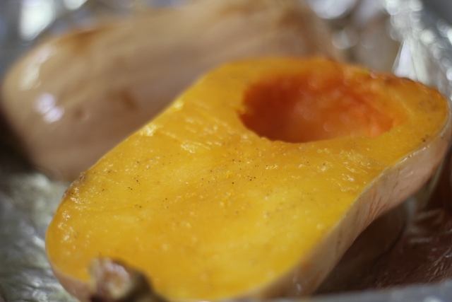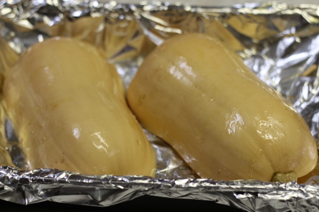 1. Итак, нашу тыкву разрезаем на две половины, вычищаем семечки, смазываем оливковым маслом, солим перчим и кладем на противень, застеленный фольгой, разрезанной стороной вниз.