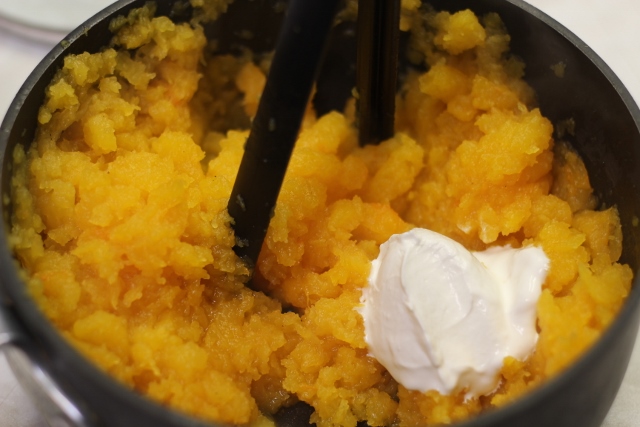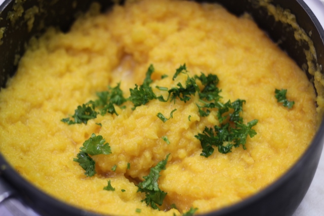2.Готовую тыкву очищаем от кожуры, перекладываем в кастрюлю и разминаем. Можно при желании использовать блендер для получения гомогенной консистенции. После, добавляем ложку сметаны, масло и еще раз разминаем, добавляем специи и свежую рубленую петрушку.