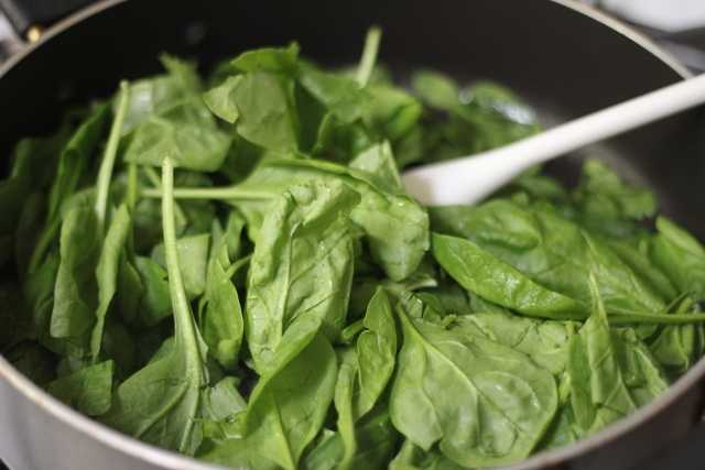 Добавляем шпинат, перемешиваем,закрываем крышкой и тушим в течении 2 минут на среднем огне.
