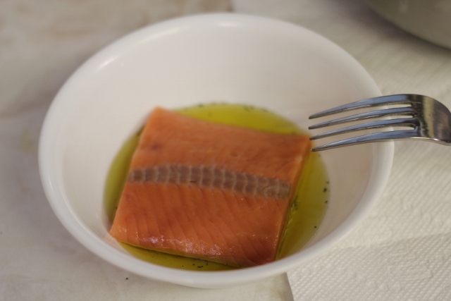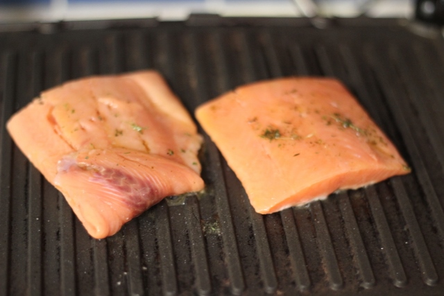 Кусочки лосося обмакиваем в масло и отправляем на гриль.
