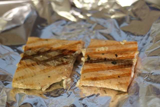Продолжительность жарки зависит от толщины кусочков. У меня был не слишком толстый стейк, поэтому 1 минута вполне достаточно. Но, важный момент: после этого перекладываем кусочки на тарелку и закрываем фольгой, так,лосось дойдет и не будет сырым, а главное, не будет сухим, что случается при пережарке.