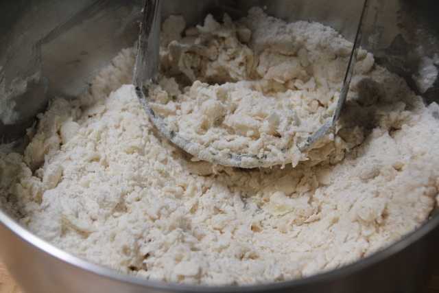 добавить размягченное сливочное масло и растереть с сухой смесью до крошки. Добавить воды и еще раз перемешать.