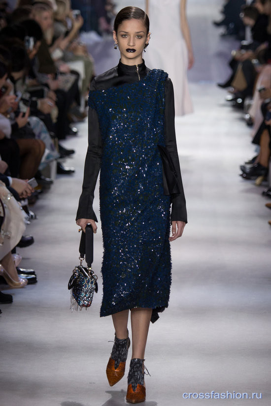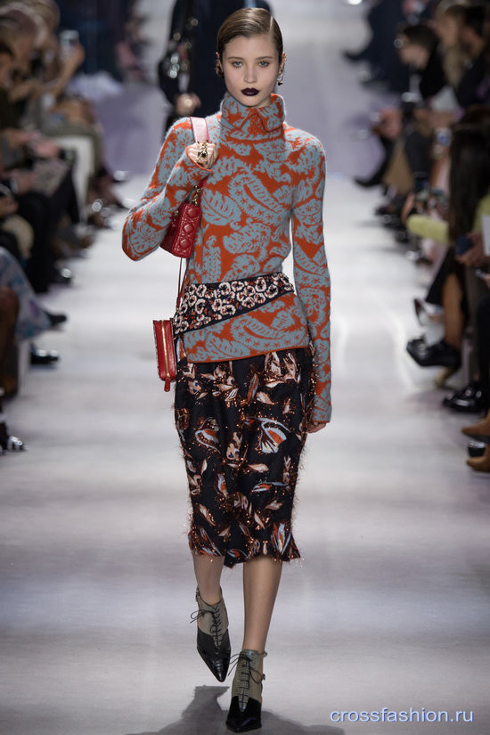 Первое и главное, что стоит отметить — дизайнеры взяли за основу традиционный приталенный силуэт и продолжили развивать тему декольте, что также характерно для стиля Дома Christian Dior. Создатели попытались в очередной раз интерпретировать классику Dior на современный лад, добавив в коллекцию вольное обращение с пропорциями, активные принты, драпировку и асимметрию.
