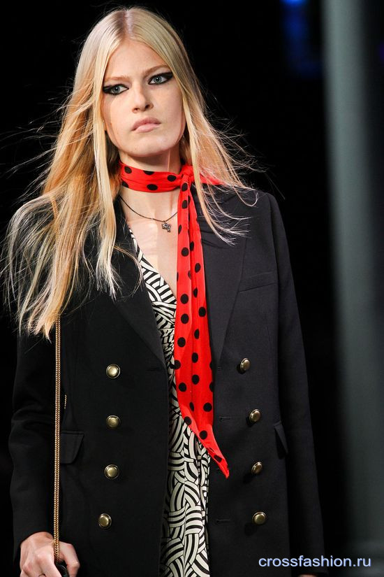 Поклонник гранжа — Эди Слиман (креативный директор Saint Laurent) тоже голосует за тонкие шарфики, концы которых обязательно должны свисать до самой талии, органично вписываясь в общую картину наряда.