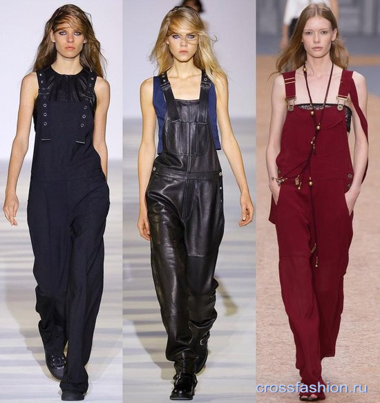 Дизайнеры продолжают ориентироваться на спортивный стиль, придавая черты тренировочных штанов даже комбинезонам (Chloe), а также развивают тему бельевого стиля, создавая шелковые комбинезоны на базе военных брюк-карго (Balenciaga).