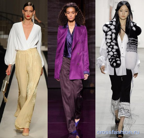 Модели блузок рубашечного кроя варьируются от почти классических моделей, декорированных аппликацией (Marco de Vincenzo) до имитации верха мужской пижамы (Fendi).