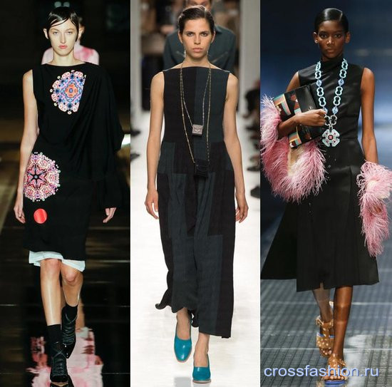 Дизайнеры не могли оставить без внимания классические сарафаны и платья рубашки, а Миучча Прада создала модель черного платья на основе «ципао» - китайского национального платья, которое в исполнении итальянского модельера стало походить на деловое платье-рубашку с воротничком стойкой.