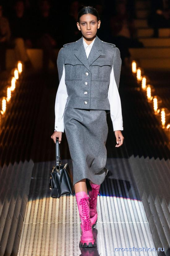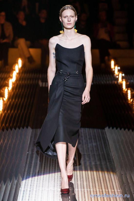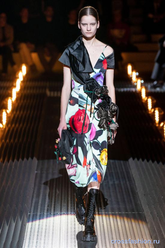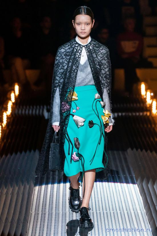 Отсылки к образам Уэнсдей Адамс и невесты Франкенштейна, милитари куртки с гигантскими накладными карманами и аппликации из роз на платьях и юбках в коллекции Prada осень-зима 2019-2020.