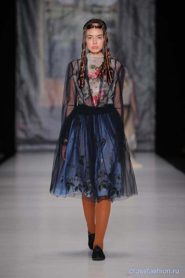 Не знаю как вам, а мне очень понравилось это местами странное нагромождение вязаных вещей, тюля, вышивки и аппликации. Понравилось, что модная нынче тема ретро не эксплуатируется так откровенно и дословно, что пышные юбки и платья дополнены современными аксессуарами — рюкзаками и поясами, что обувь сплошь вся удобная и без претензий на сексуальность. Понравились эти тонкие, женственные образы еще больше усиленные кукольными париками и съехавшими, как будто детскими колготками.