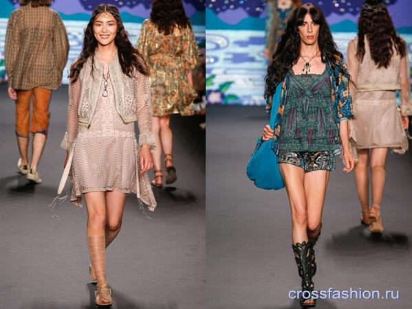 И тем не менее, есть не мало дизайнеров создающих целые коллекции в стиле бохо, например Анна Суи. Ее конек — сочетание несочетаемых материалов и фактур. Связанные в разных техниках полотна прекрасно уживаются с тонкими, летящими тканями и грубой кожей, все это щедро сдобрено украшениями в этно — стиле, объемными сумками, бахромой и экзотическими принтами, что дает на выходе чудесные образы героинь романов в жанре фэнтези.