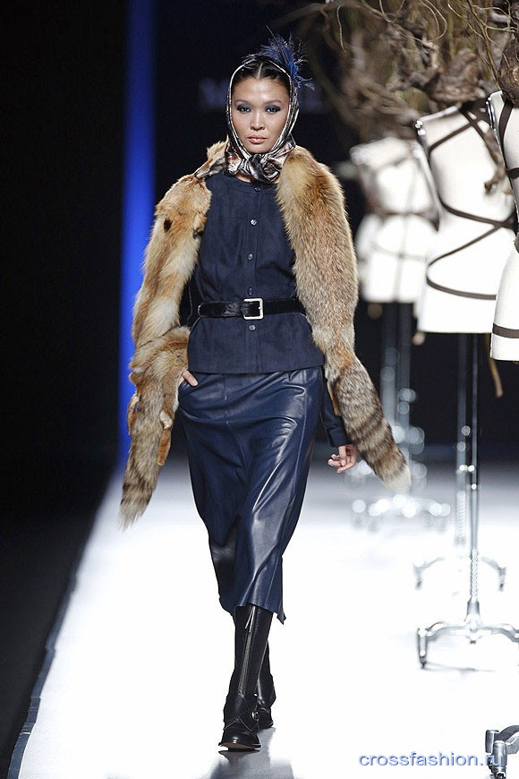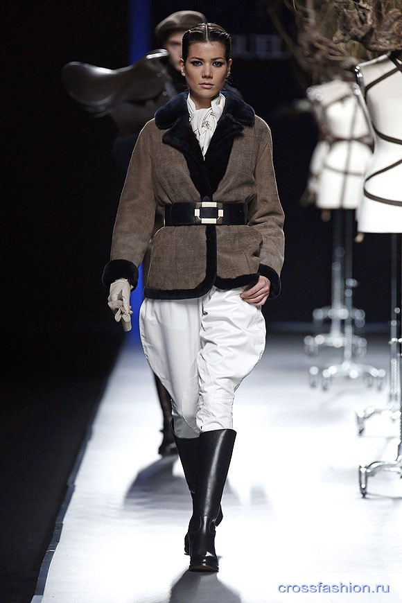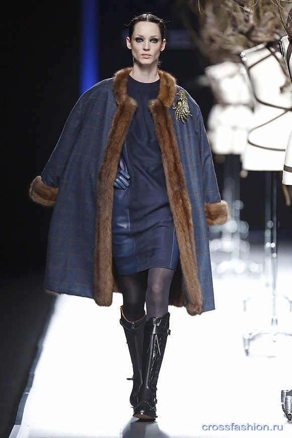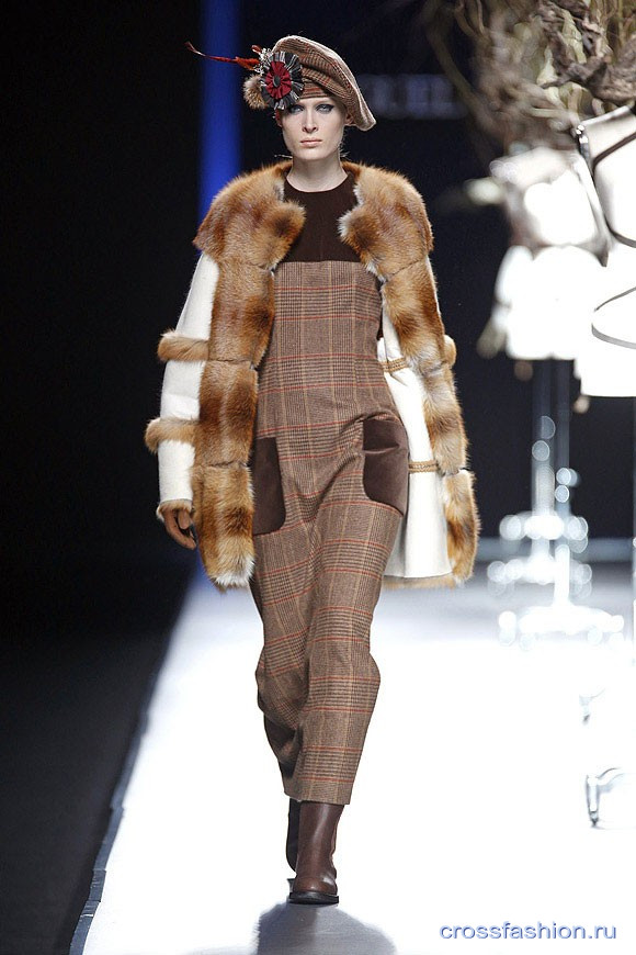 Очевидно, что испанский дизайнер Мигель Маринеро создавая свою коллекцию вдохновлялся мотивами охоты. Его клетка — скорее элемент маскировки ловца зверей в заснеженном лесу, где переплетение голых ветвей деревьев создает причудливый клетчатый орнамент. Меха, высокие сапоги без каблука и лихо заломленные охотничьи береты очень тонко передают дух коллекции, а черные, женственные шубки задают элегантный тон.