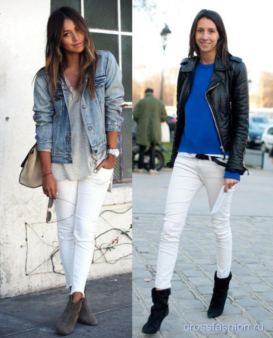 Что касается верхней одежды, максимальный вариант для белых джинсов — кожаная куртка, кардиган, легкая парка или куртка из замши. Более теплые куртки, пуховики и тем более шубы совсем не гармонируют с откровенно летними, белыми джинсами.