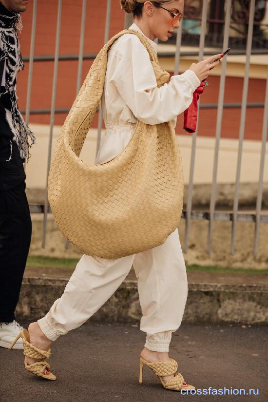 Стрит стайл европейских Недель моды сезона осень-зима 2020-2021 запомнится другой моделью сумки Bottega Venetta — плетеной сумочкой прямоугольной формы, а клатчи-пельмени хоть и встречаются на фото, но уже не вызывают такого бурного восторга.
