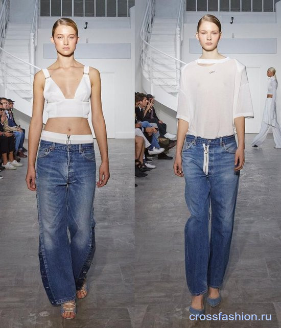 Создатели коллекций продолжают развивать тему моды 70-х, смешивая характерные детали той эпохи с элементами моды 80-х и 90-х. Отсюда закономерная популярность расклешенных брюк и джинсов в коллекциях весна-лето 2016. Кроме этого можно отметить, что посадка на талии и модели джинсов с завышенной талией все еще актуальны, хотя вместе с ними дизайнеры не оставляют без внимания фасоны джинсов с классической посадкой (на линии между талией и бедрами) и даже посадкой на бедрах.