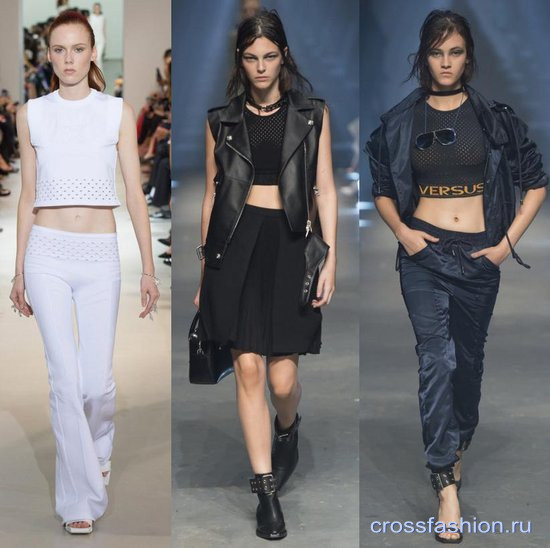 Укороченные топы также не имеют ничего общего с популярными летом 2013 года топами-бюстье, тяготевшими к стилю «нью-лук». Теперь это гладкие спортивные топы с закрытой зоной декольте или же довольно свободные топы с высоким вырезом горловины.